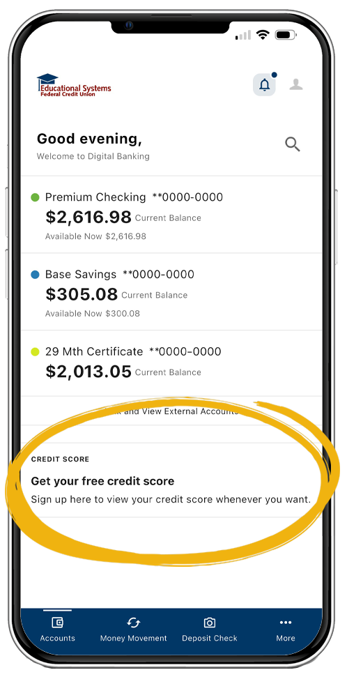 Log into Digital Banking and select the “Get your free credit score” tile from the Accounts view. From there, you can quickly enroll and begin monitoring your credit. With SavvyMoney, you’ll enjoy: